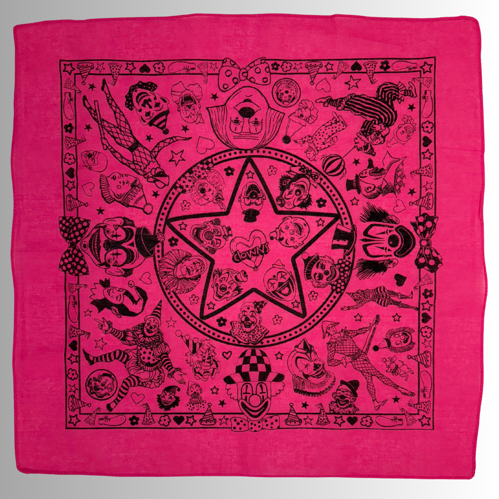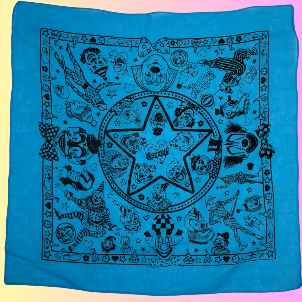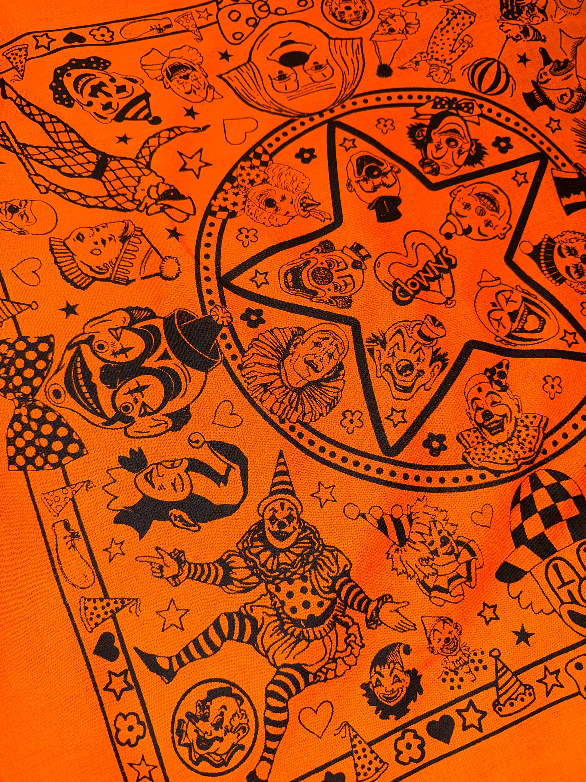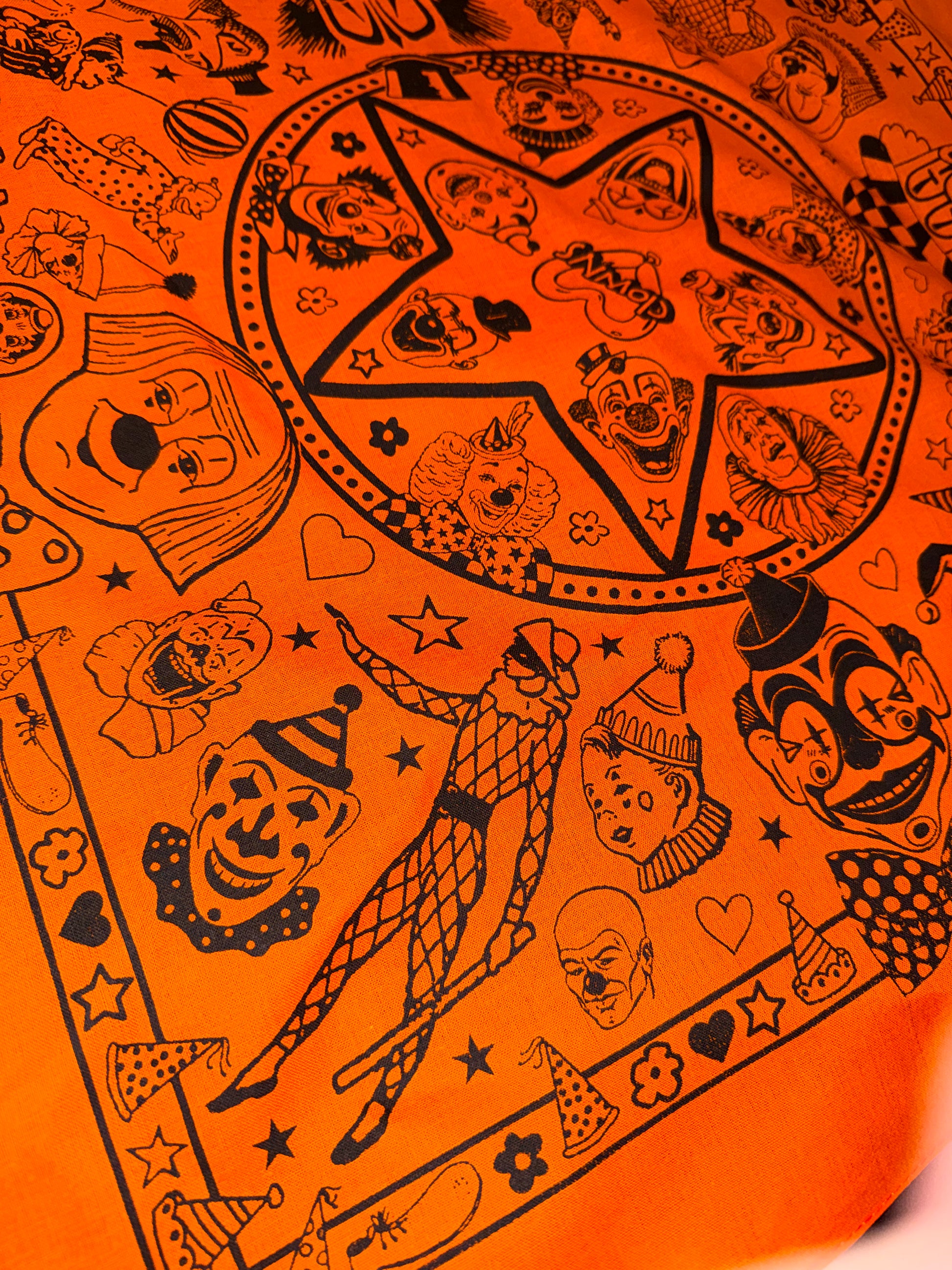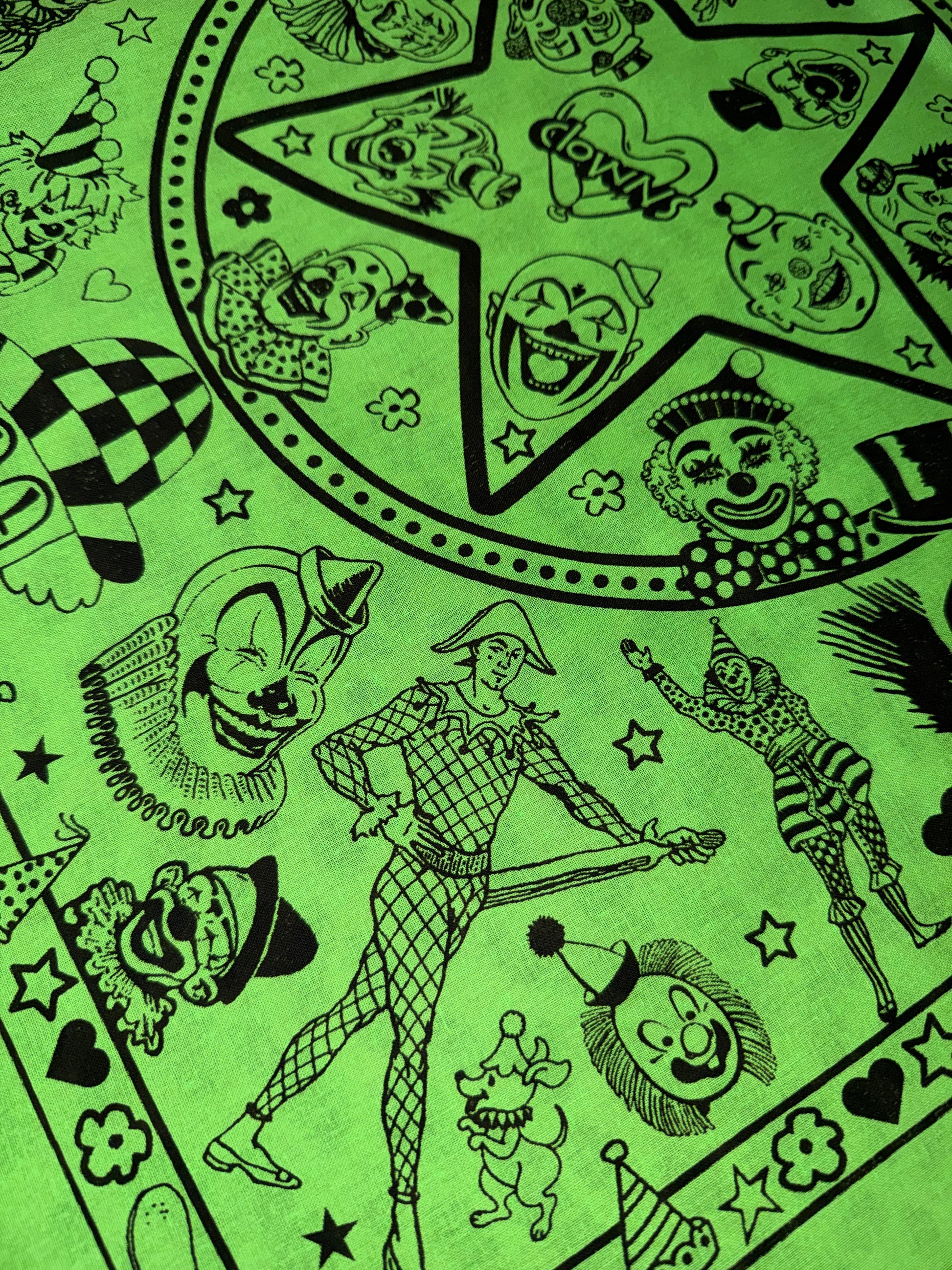 Welcome to the big top of camp. This hand–silk-screened clown bandana is a technicolor shrine to vintage circus iconography, drag-adjacent theatrics, and unapologetic queer play. It’s bold, graphic, a little deranged, and absolutely perfect.