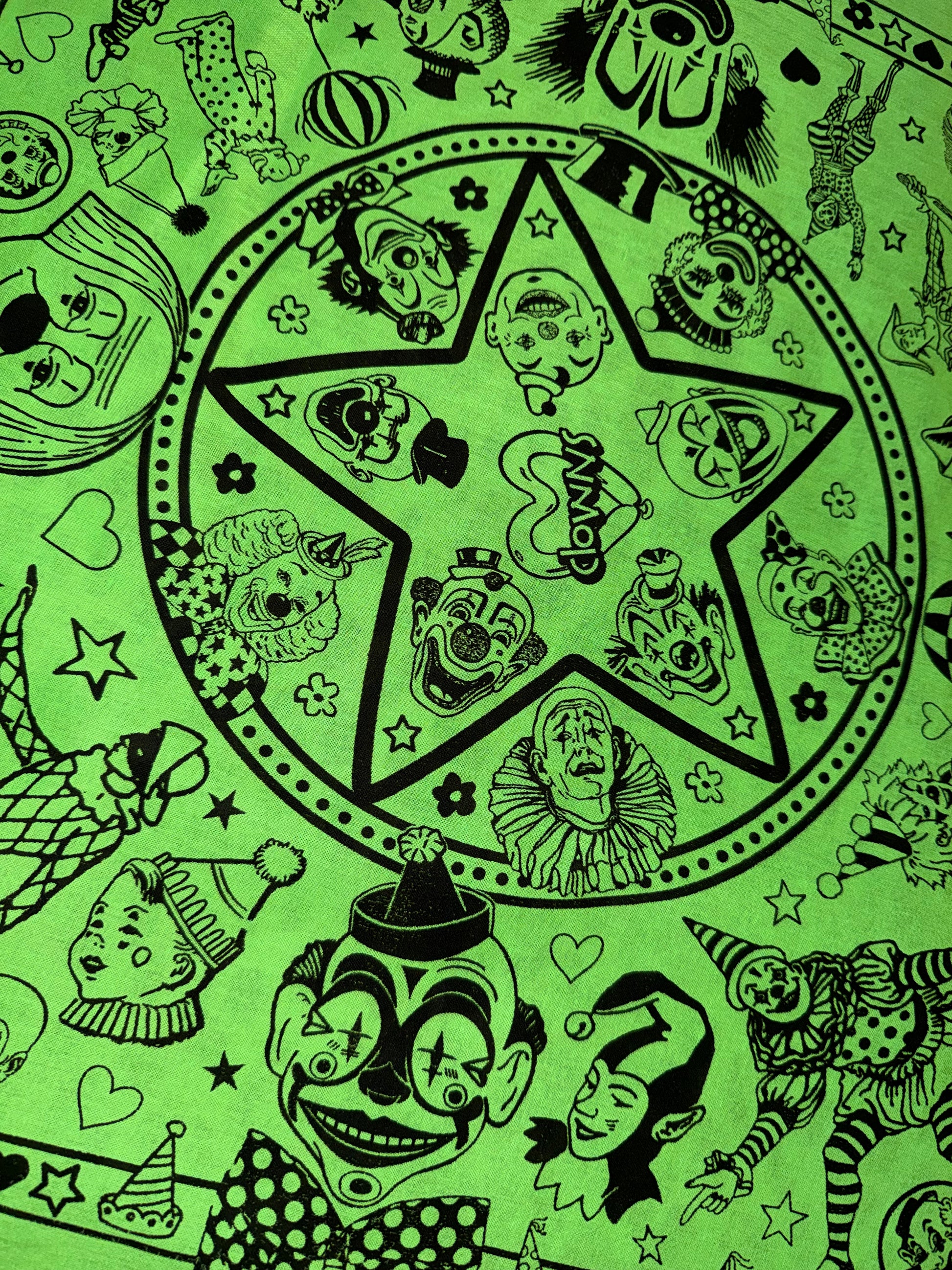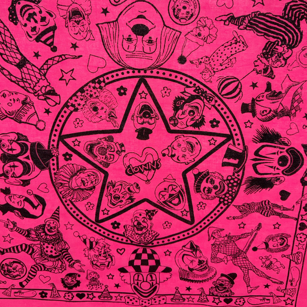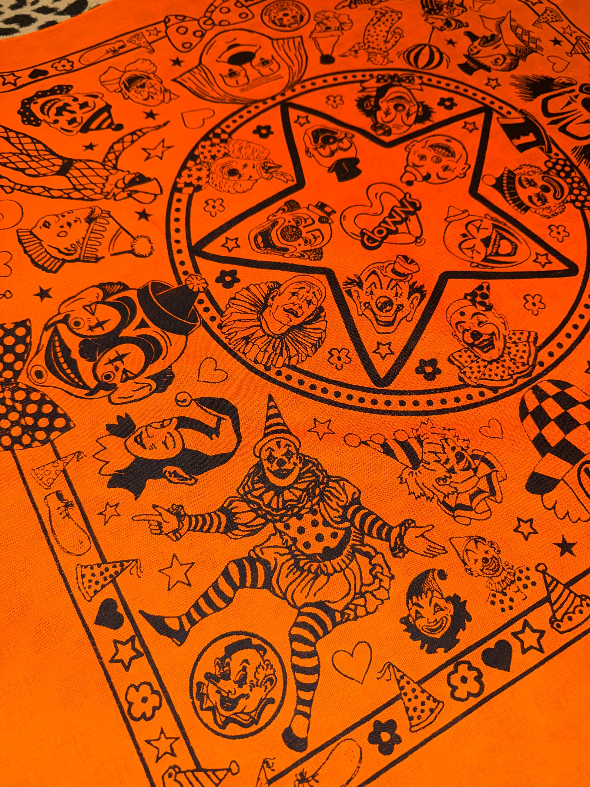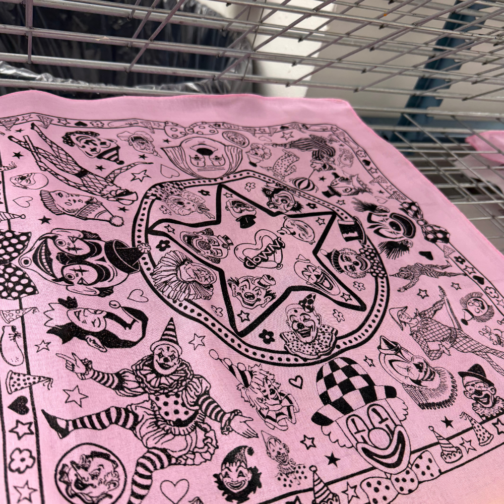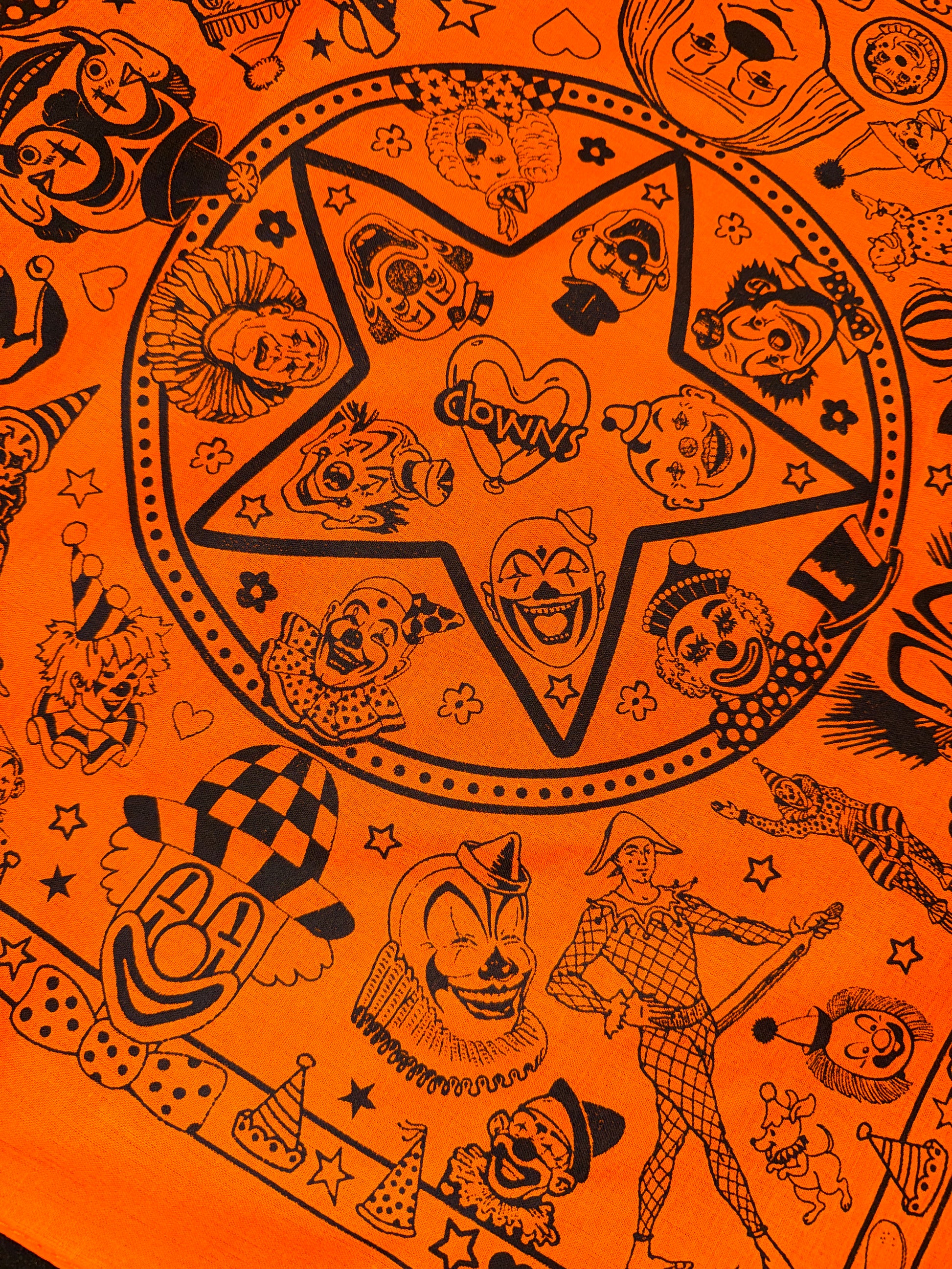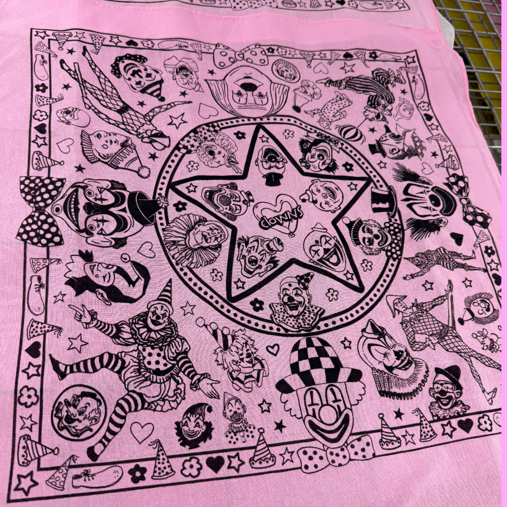 Welcome to the big top of camp. This hand–silk-screened clown bandana is a technicolor shrine to vintage circus iconography, drag-adjacent theatrics, and unapologetic queer play. It’s bold, graphic, a little deranged, and absolutely perfect.