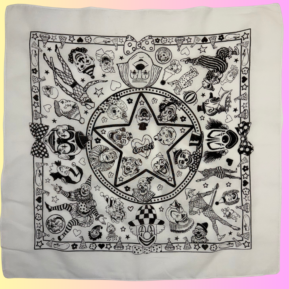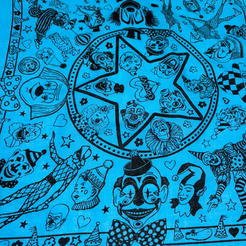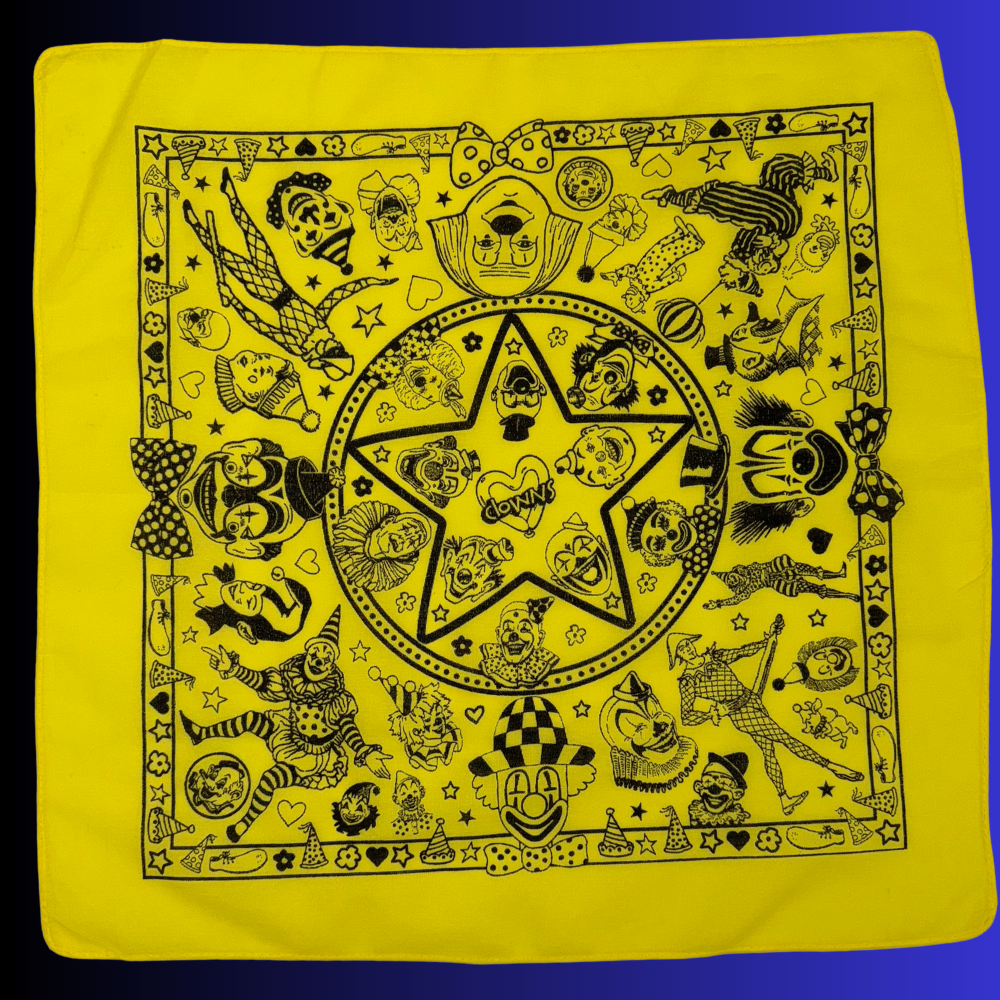 Featuring dozens of illustrated clowns, jesters, bow-tied gremlins, and carnival eccentrics, this bandana doubles as both an accessory and a full mini-art print. Wrap it, frame it, tie it to your bag, or fly it from your belt for those who speak… flagging dialect.