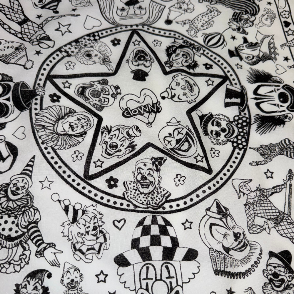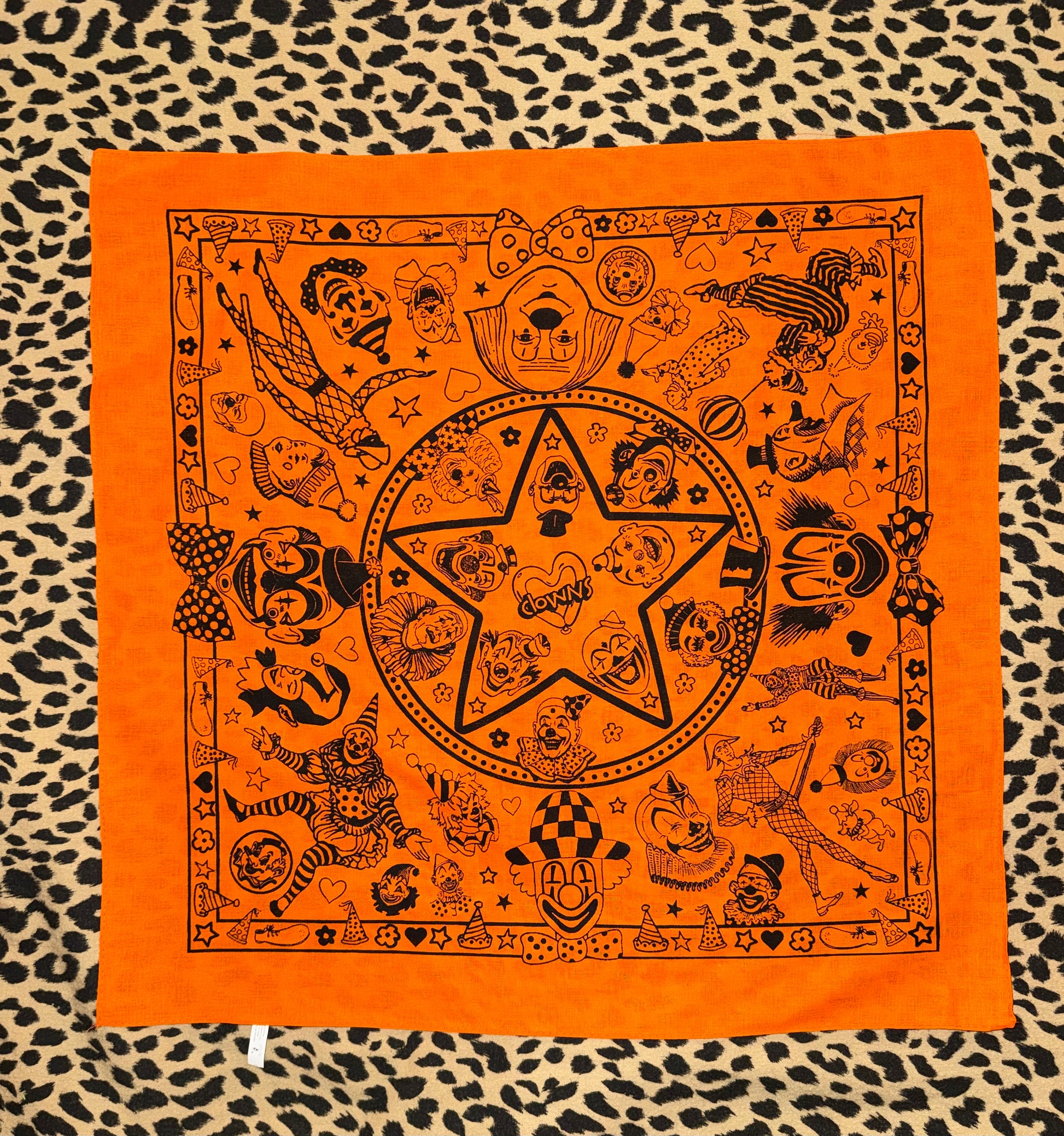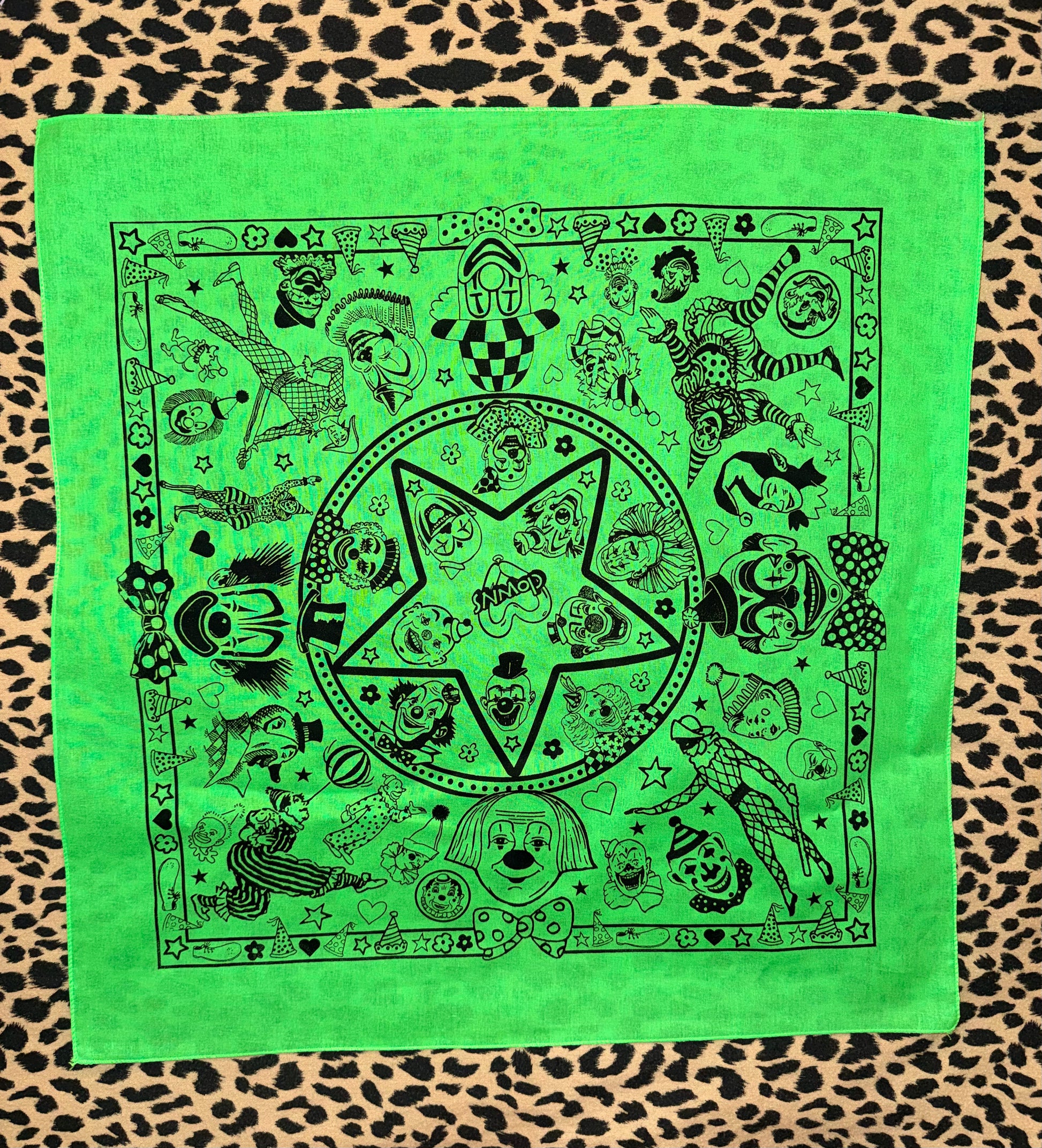 Featuring dozens of illustrated clowns, jesters, bow-tied gremlins, and carnival eccentrics, this bandana doubles as both an accessory and a full mini-art print. Wrap it, frame it, tie it to your bag, or fly it from your belt for those who speak… flagging dialect.