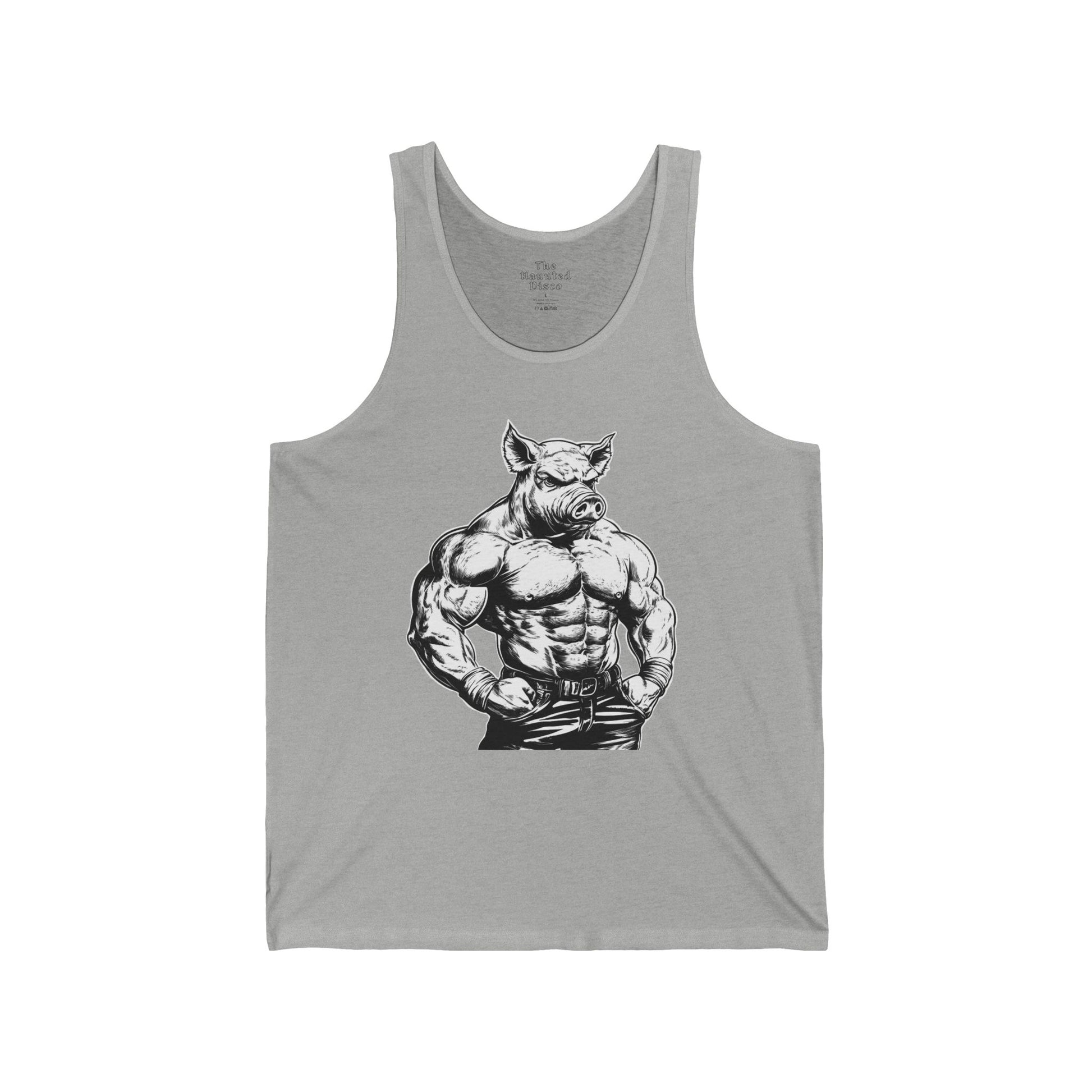 Built, beefy, and filthy in the best way. The Muscle Pig tank takes pig pride literally—fusing Tom of Finland–style muscle fantasy with a snarling pig head. It’s queer fetish art on your chest, a loud signal for the leather, kink, and piggy community.