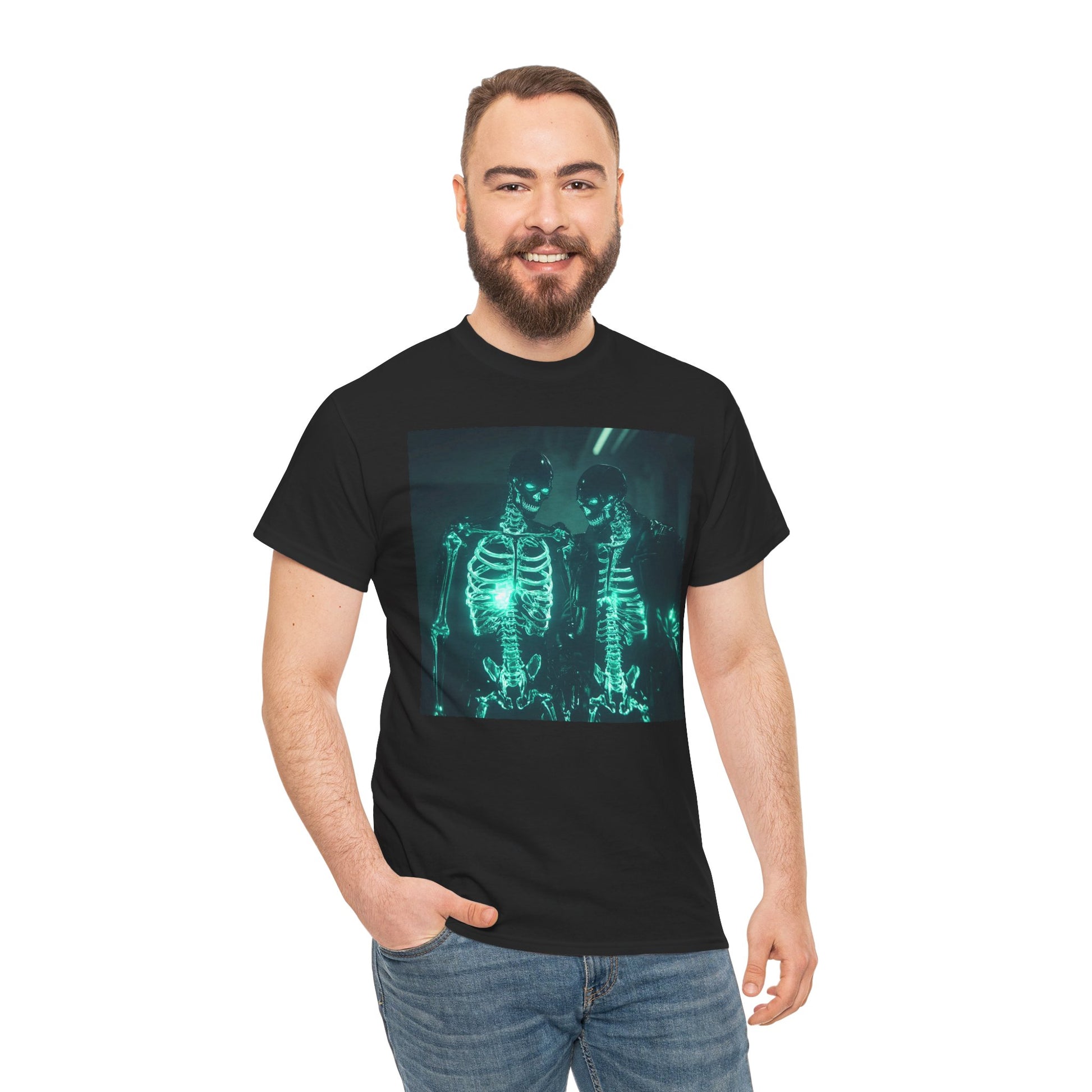 Original design from The Haunted Disco. Glowing Skeletons giving a Goth Biker Punk Rocker Spooky Halloween vibes. Edgy - rebellious vibe, perfect for those who love the darker side of fashion. Ideal for Halloween, concerts, or everyday wear for fans of alternative styles. Product features - Shoulder tape for stability - Tubular knit without side seams for a sleek look - Ribbed knit collar for elasticity - Made from strong and smooth fabric for printing - Ethically sourced US cotton Care instructions - Non-chlorine: bleach as needed - Do not iron - Do not dryclean - Machine wash: cold (max 30C or 90F) - Tumble dry: low heat