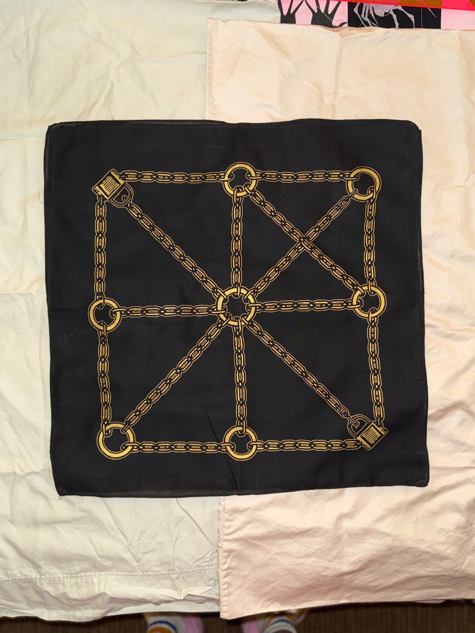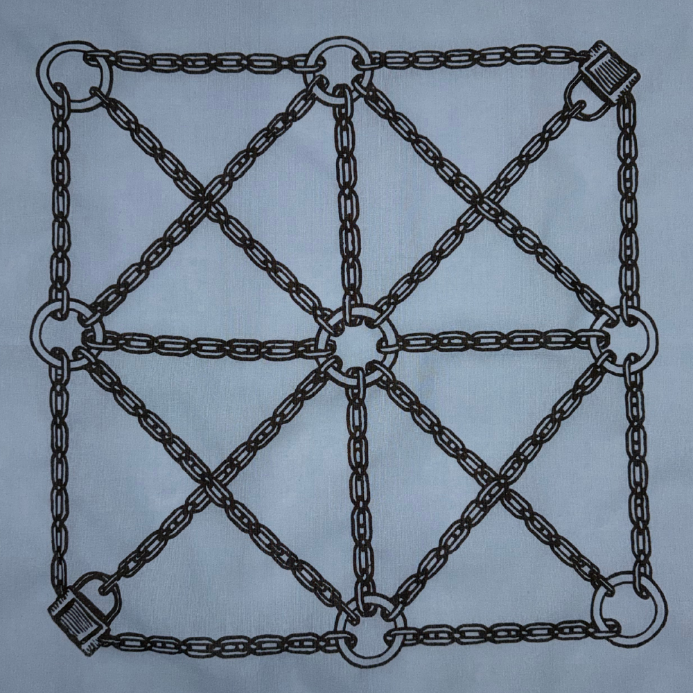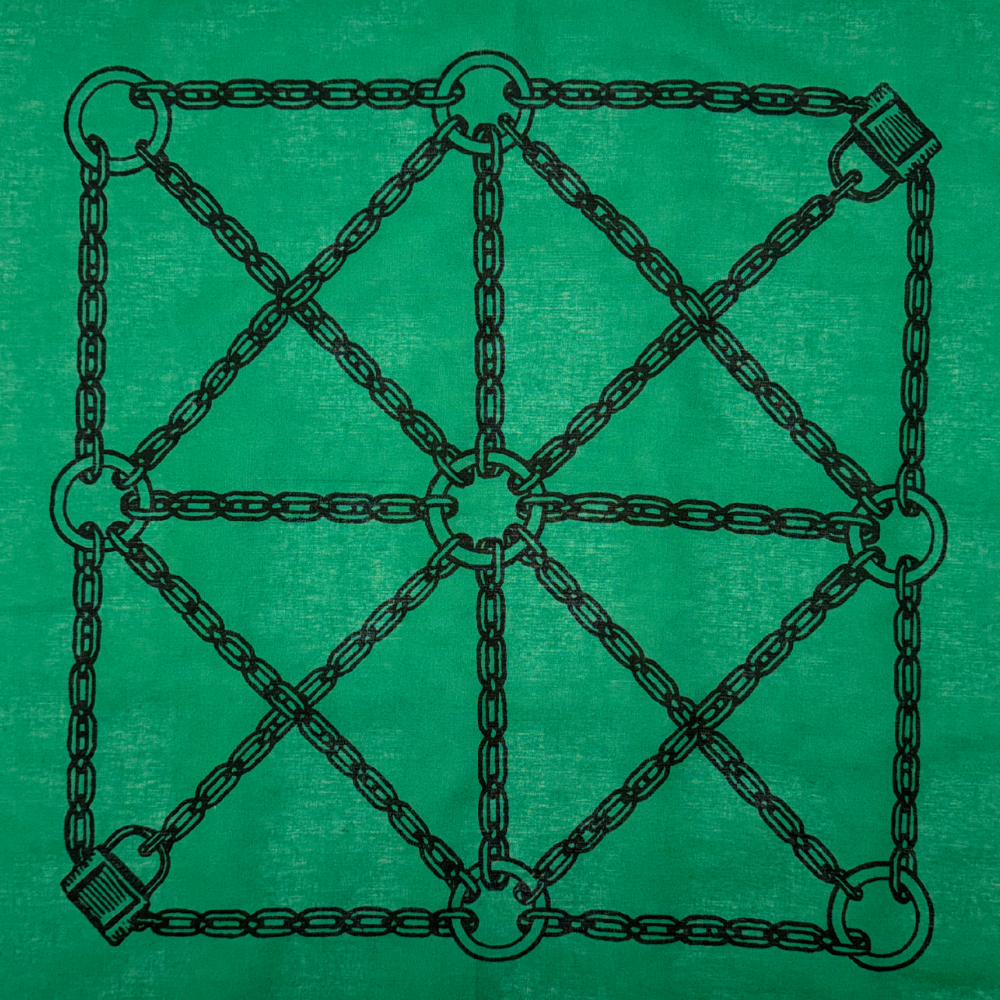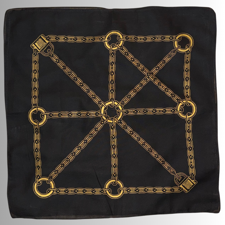 Lock it in—literally. This hand silk screened bandana is your invitation to play with boundaries, codes, and color. Whether you’re flagging, flirting, or just showing off a taste for the decorative and deviant, this piece is all about the tension between restraint and expression. The black ink chain grid connects every edge in a perfect geometry of control, punctuated with padlocks in opposing corners—because sometimes fashion should come with a safeword.