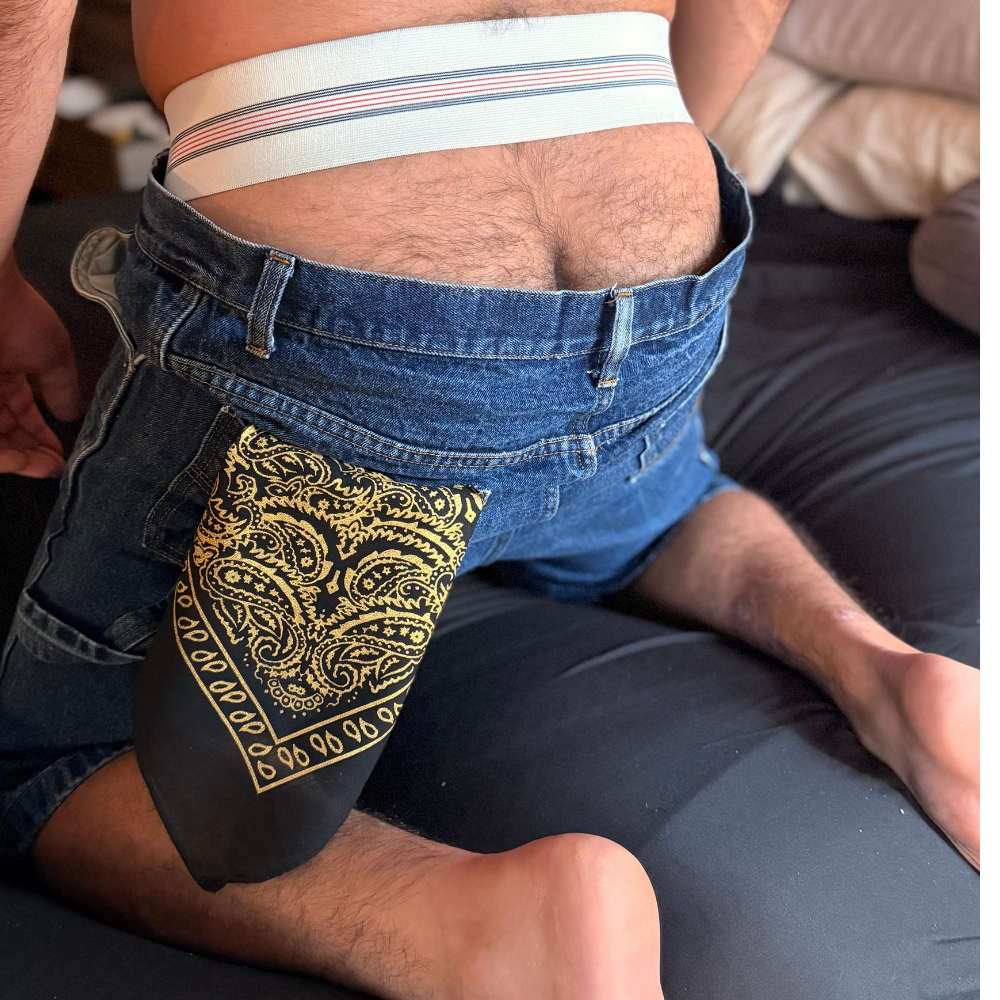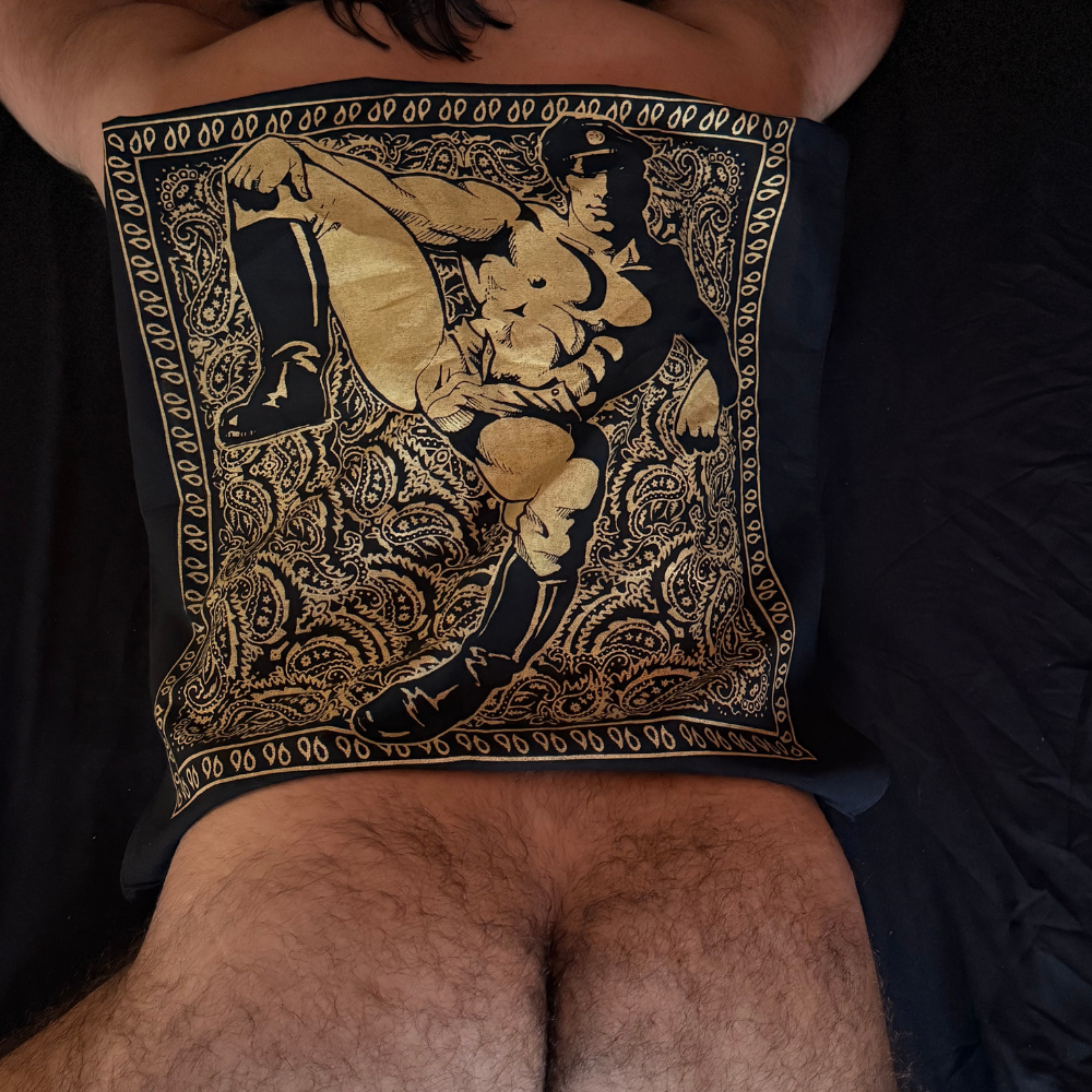 Each print is hand silk-screened in NYC in small batches, so no two are ever alike. The linework is bold, erotic, and archival — a visual love letter to the golden age of underground illustration. Whether worn as a flag, framed as art, or tied for trouble, it’s a piece that speaks fluent queer history.