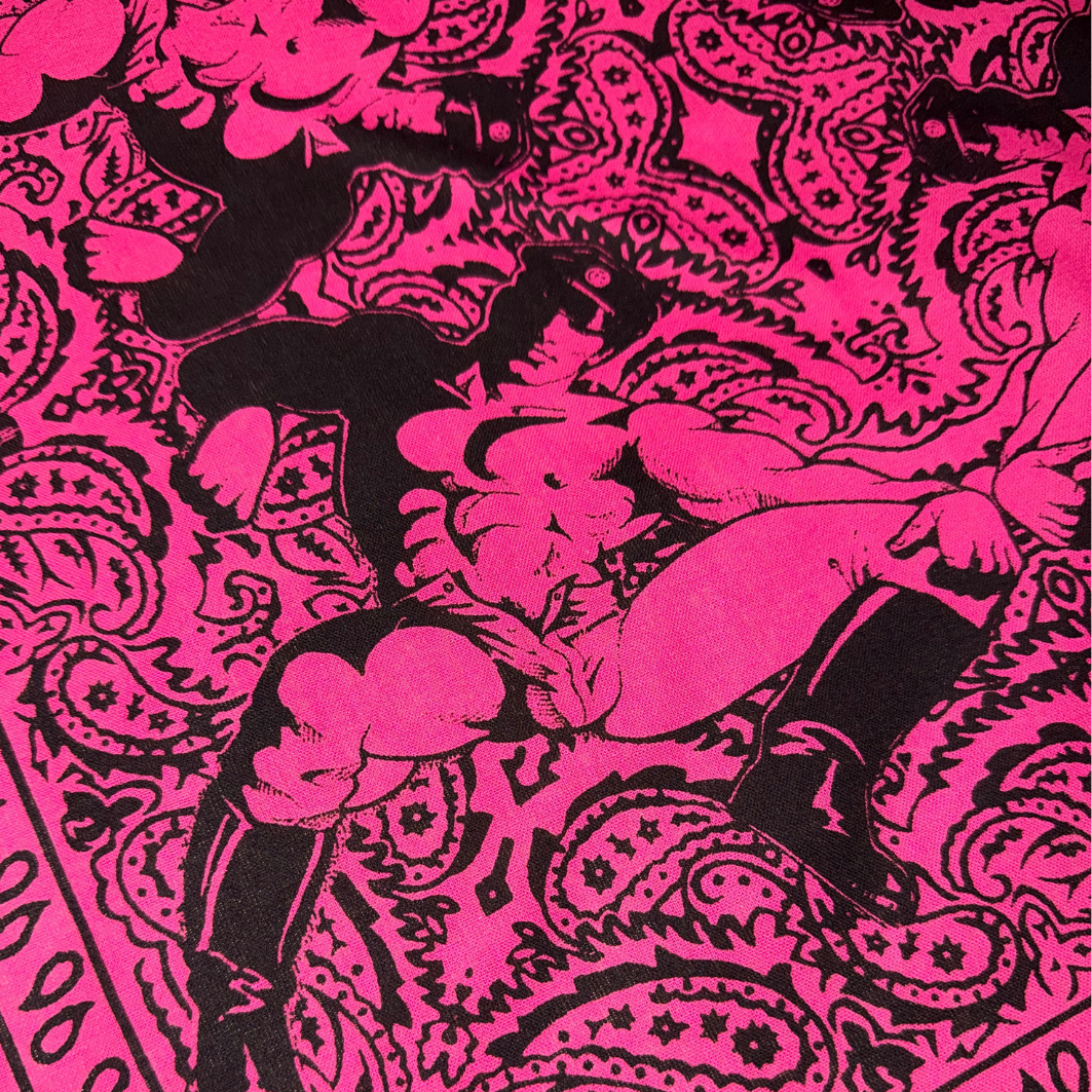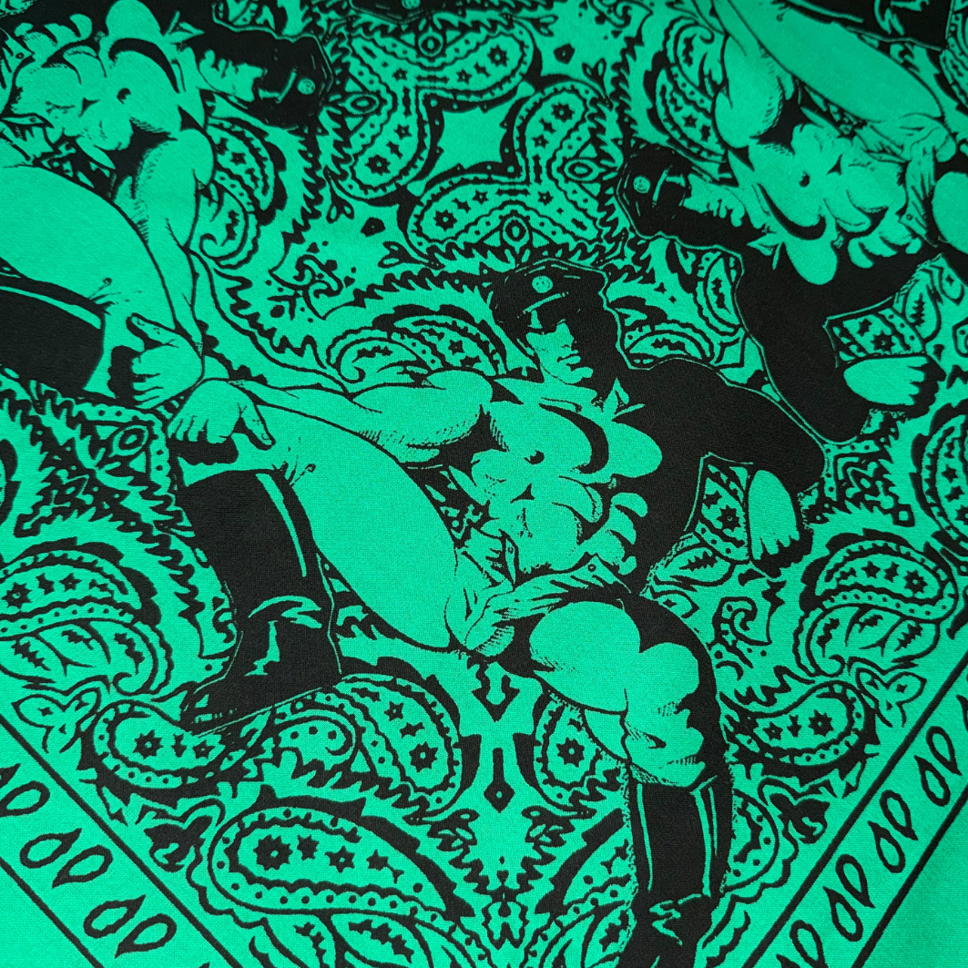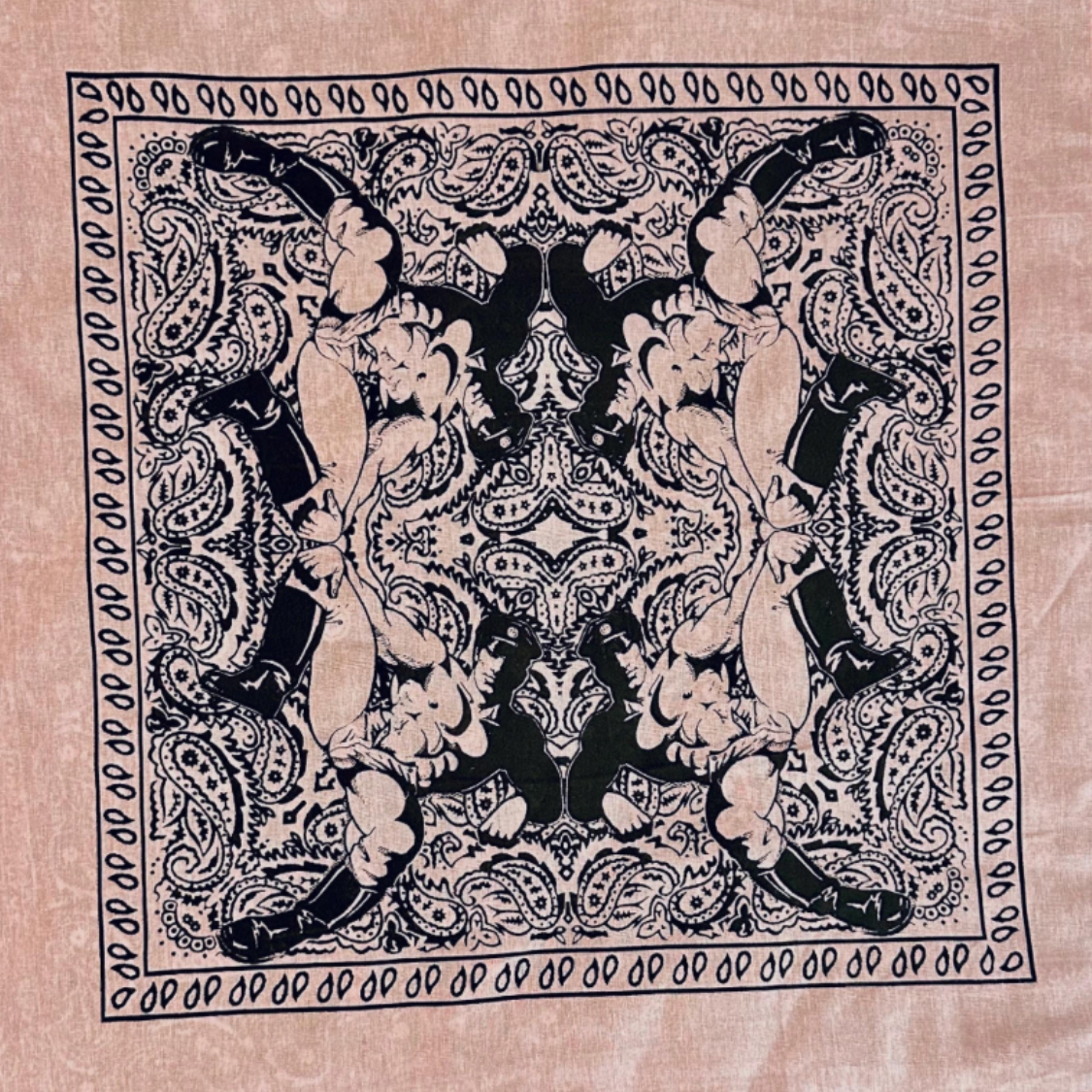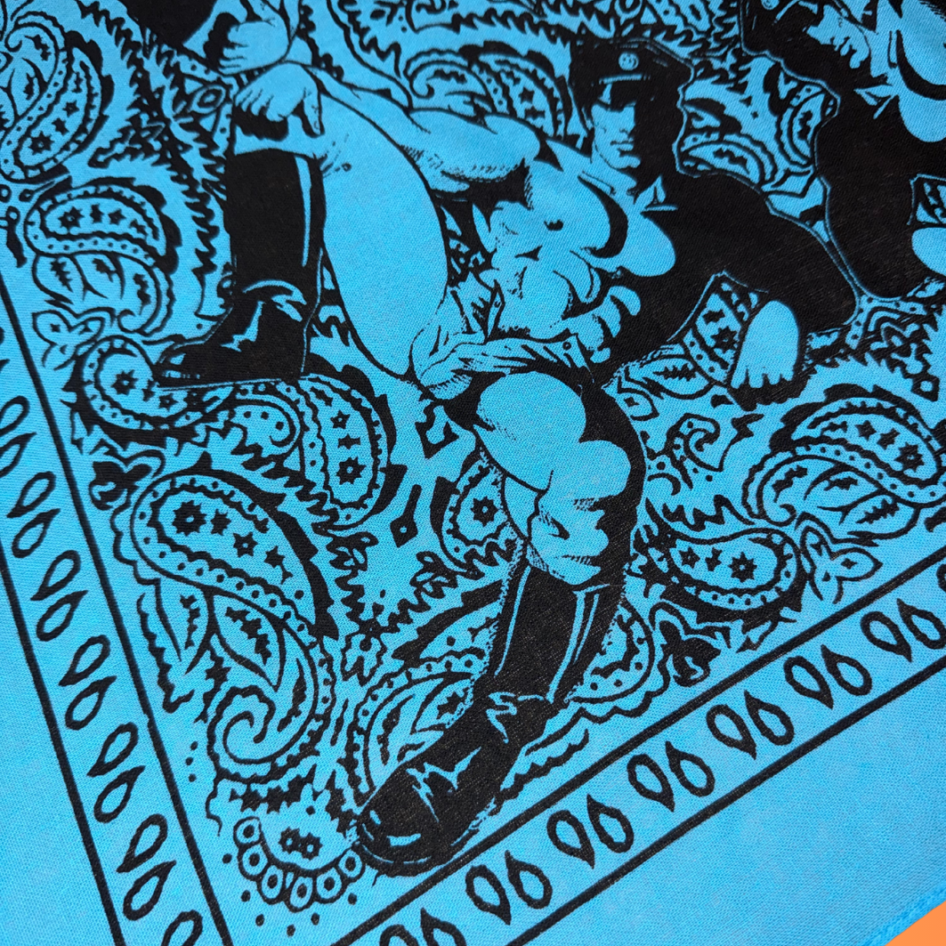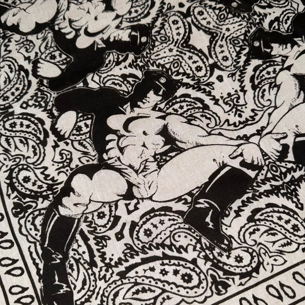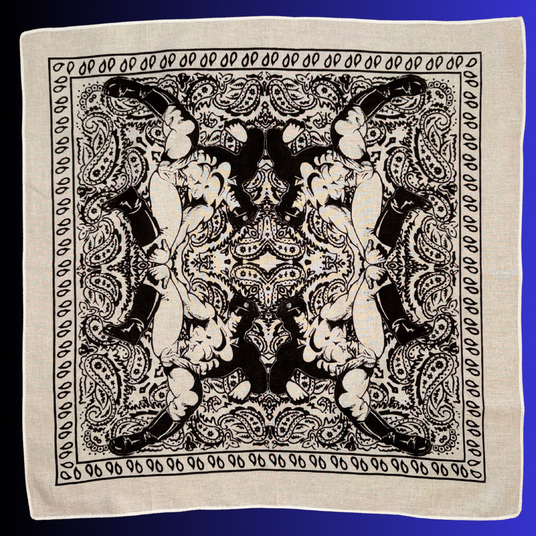This hand silk-screened cotton bandana reimagines the paisley standard through a queer lens, centering one of Dom “Etienne” Orejudos’s unmistakable men: statuesque, knowing, and ready to rewrite the visual code of masculinity. Positioned in each corner this design is ideal to wear around the neck like a bandit or flagging out of you back pocket.