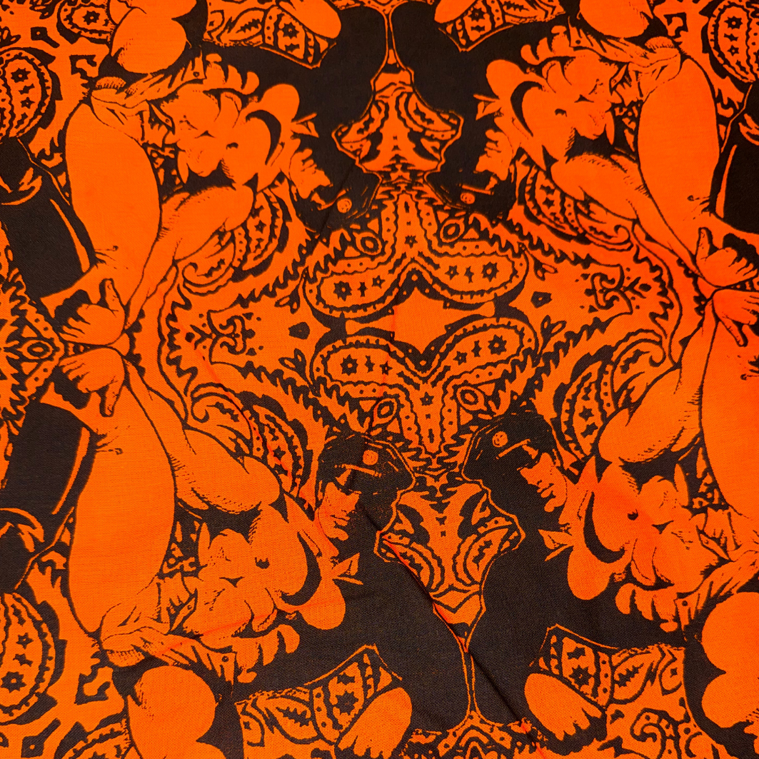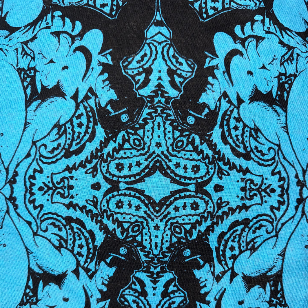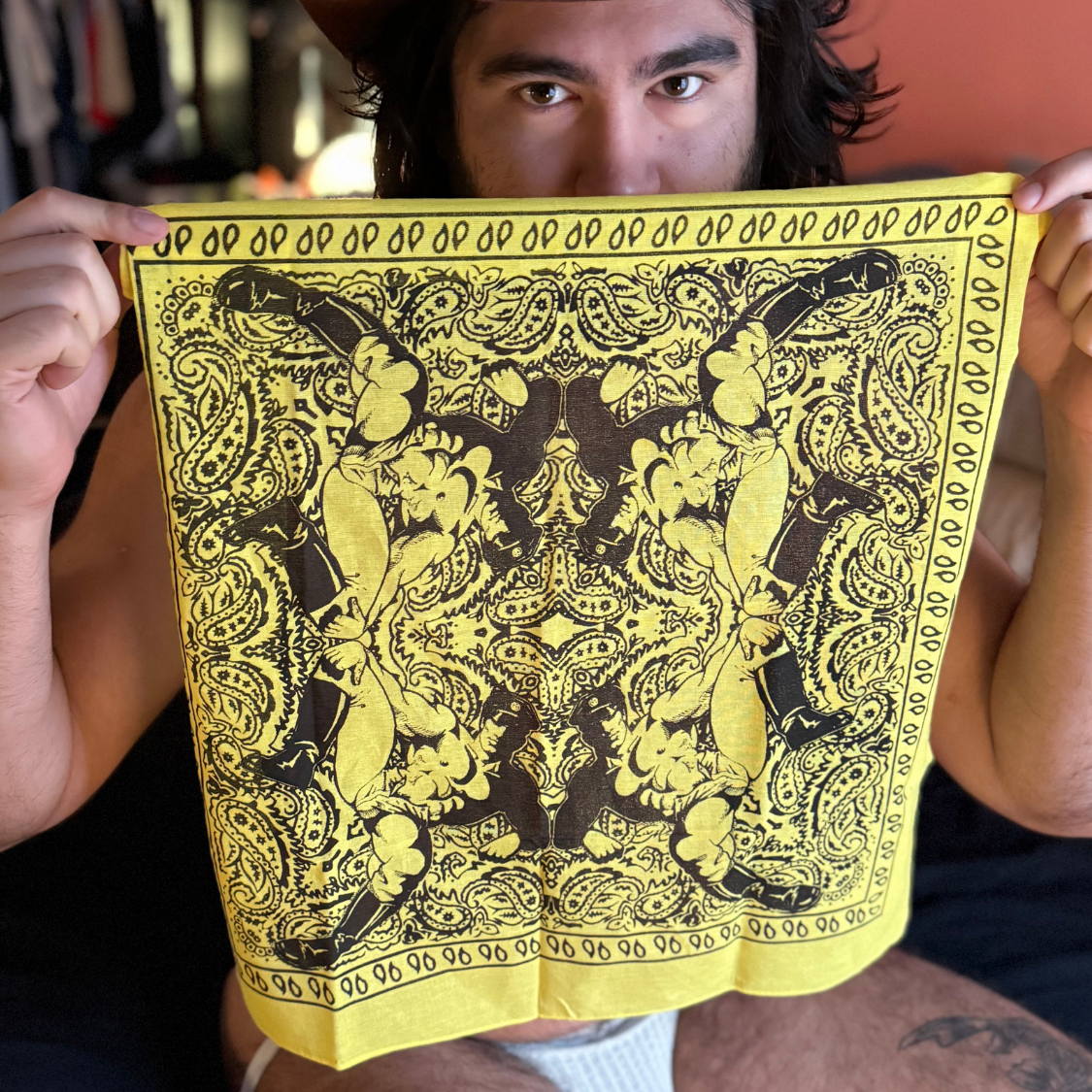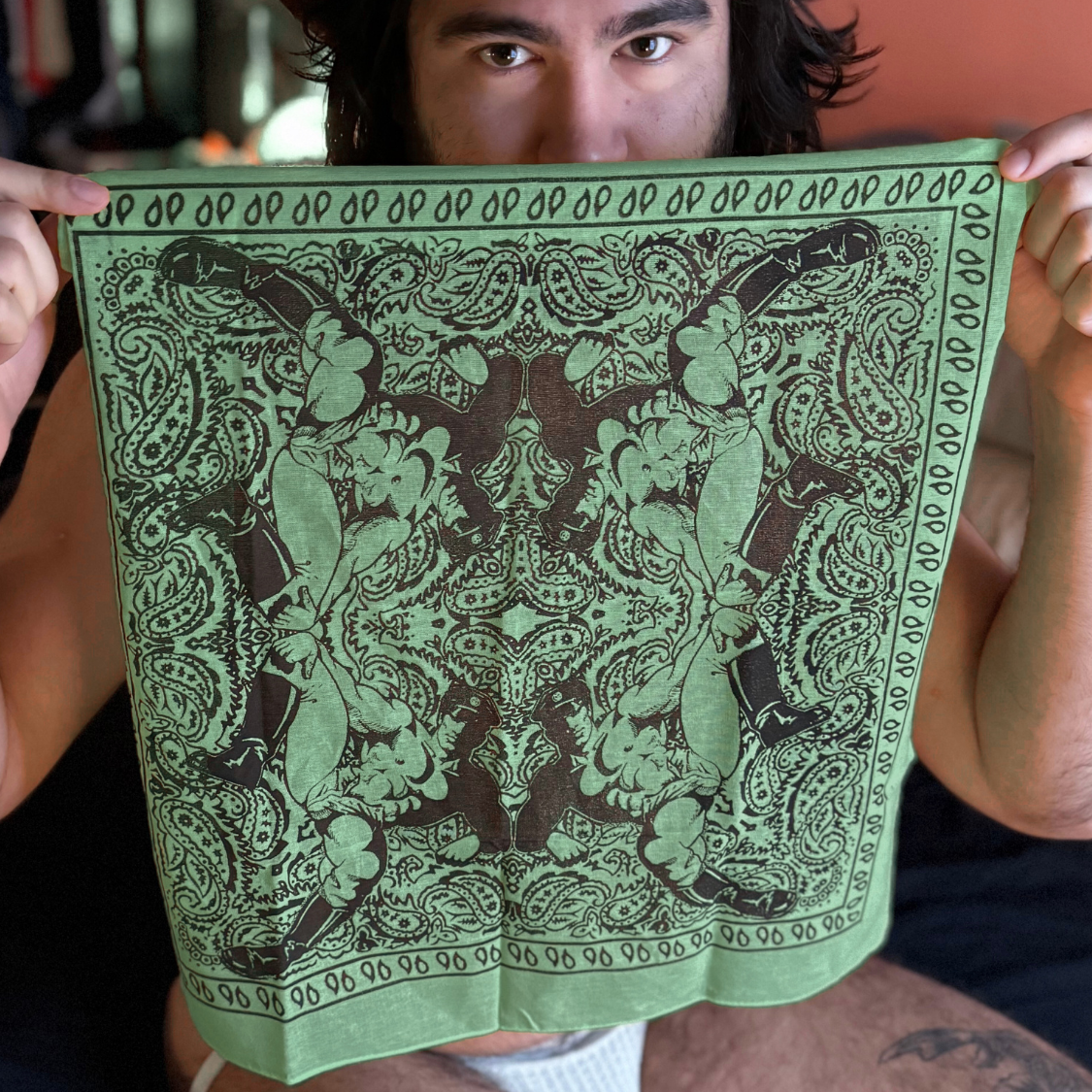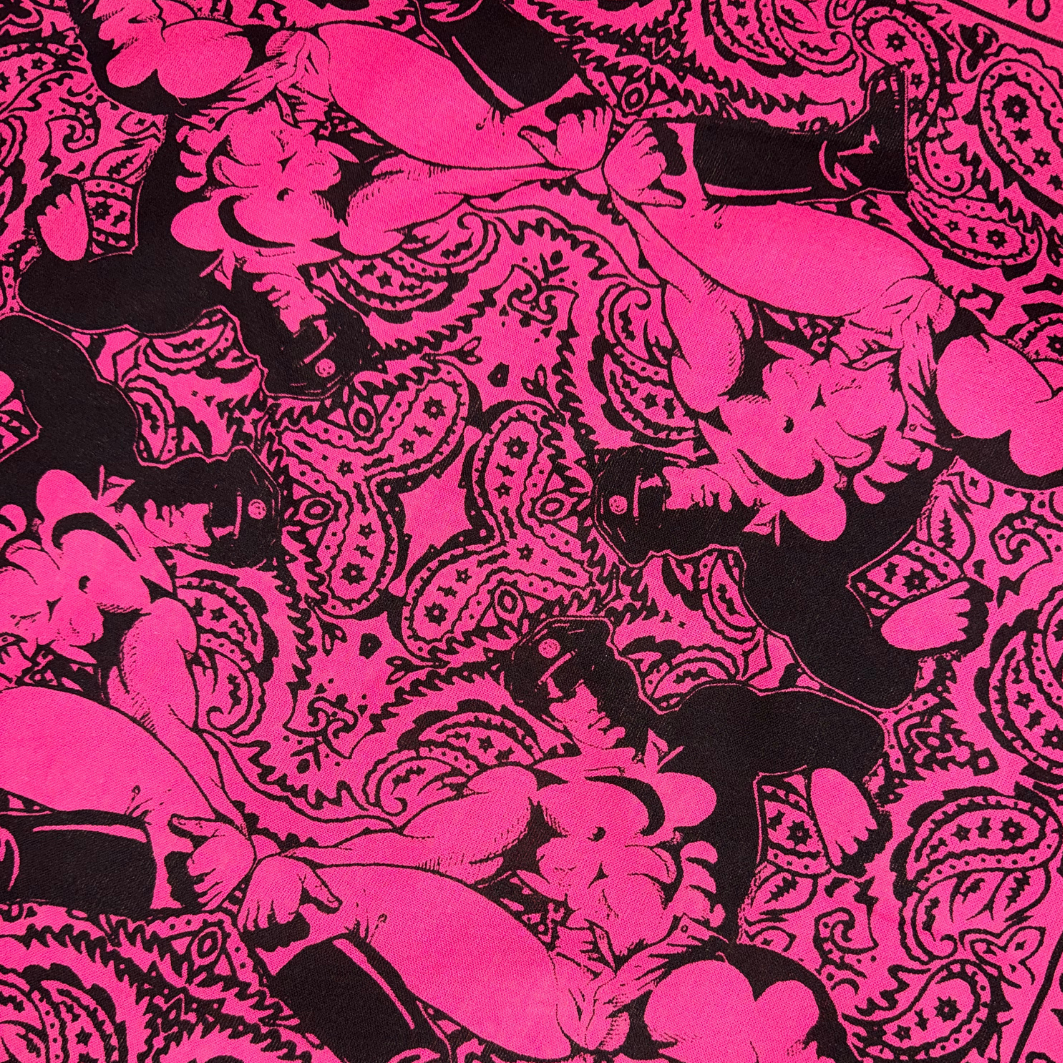 This hand silk-screened cotton bandana reimagines the paisley standard through a queer lens, centering one of Dom “Etienne” Orejudos’s unmistakable men: statuesque, knowing, and ready to rewrite the visual code of masculinity. Positioned in each corner this design is ideal to wear around the neck like a bandit or flagging out of you back pocket.