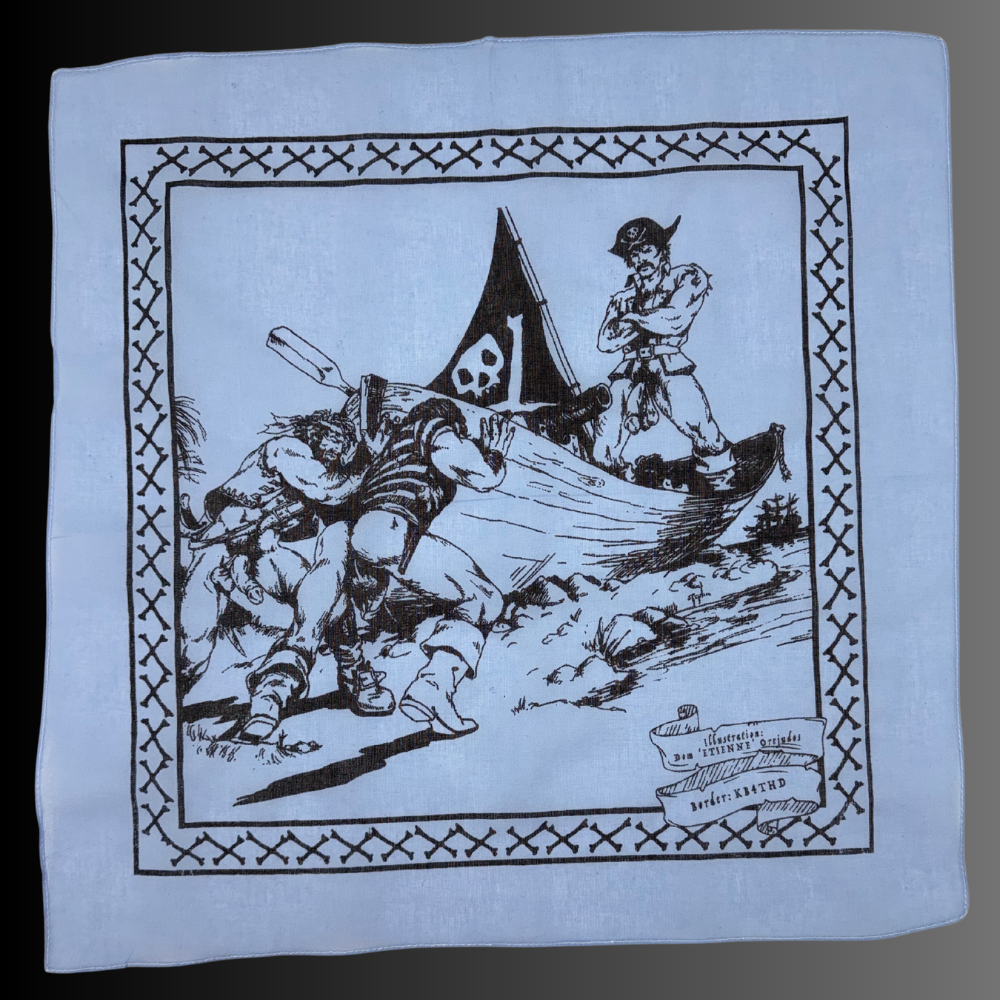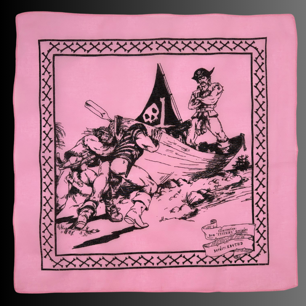This limited-run hand-silkscreened bandana showcases an iconic illustration by Dom “Etienne” Orejudos—one of the most celebrated creators of homoerotic fantasy and leather-culture artwork. His unmistakable muscular sailors and pirates meet an original border created by KB4 for The Haunted Disco (KB4THD), designed to complement Etienne’s classic linework with a modern queer outlaw frame.