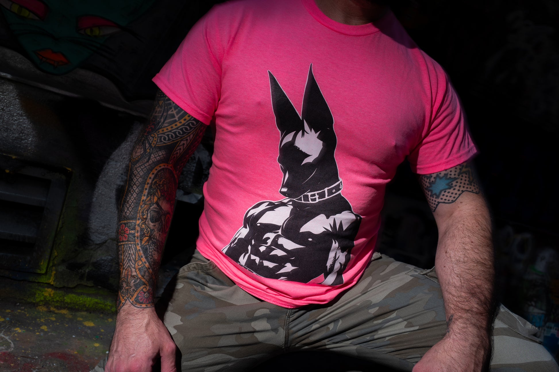 This graphic tee features an Anubis-inspired fox pup rendered in bold, high-contrast linework — part ancient Egyptian deity, part modern leather-bar iconography. The artwork draws on the visual language of dominance, loyalty, and ritual, blending classical symbolism with contemporary queer subculture in a way that reads as art-forward rather than literal.