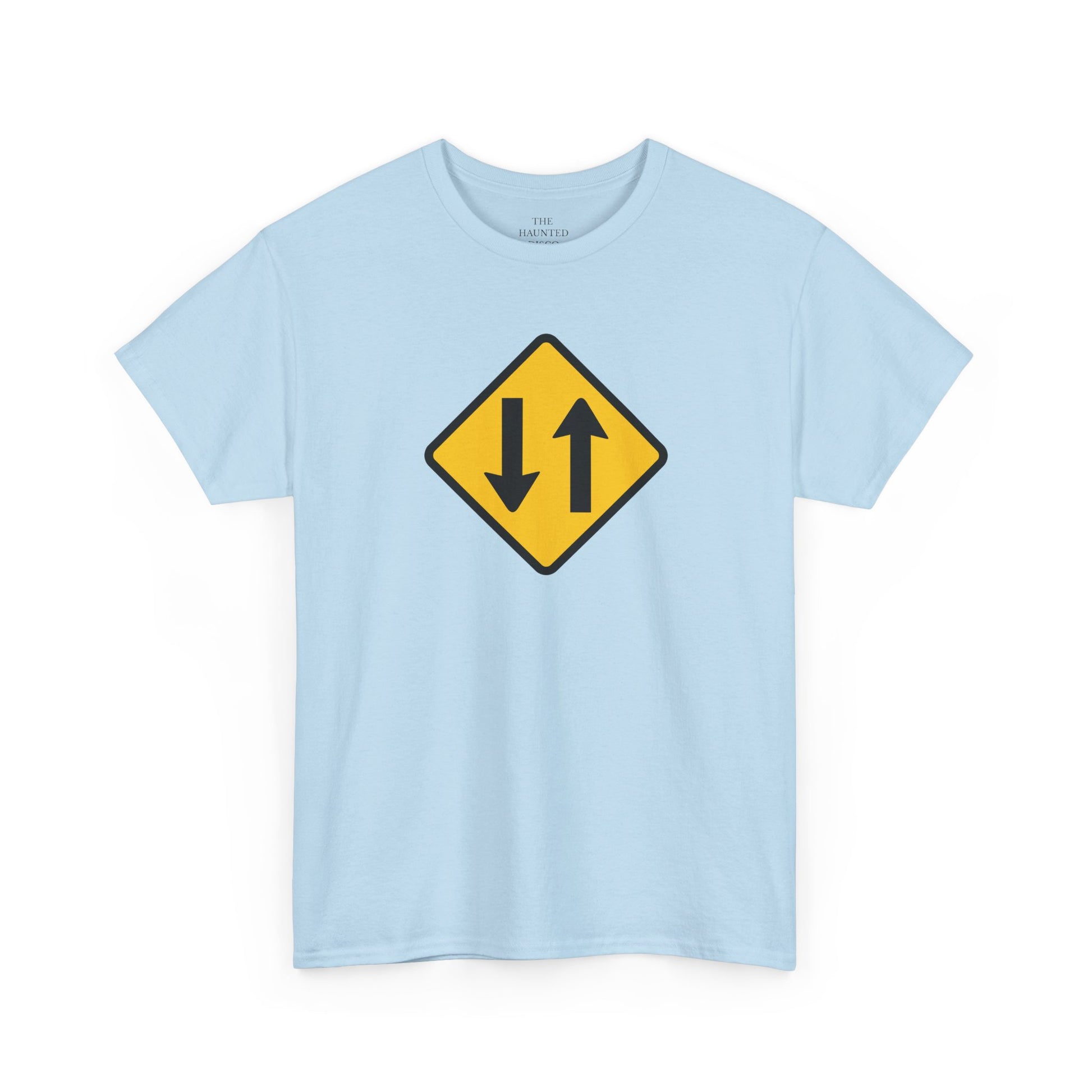This tee features a two-way traffic sign graphic—arrows pointing in both directions, balanced and unmistakable. On the street, it’s about flow. Worn on a body, it becomes a quiet wink: a visual shorthand for versatility, openness, and not needing to pick just one lane.